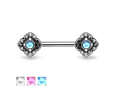 Украшение из родированной латуни со стразами, штанга из хирургической стали 316L.