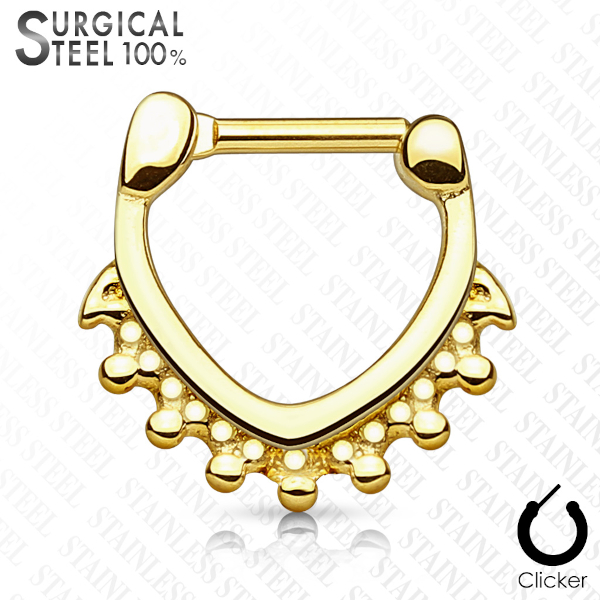 Треугольный кликер из хирургической стали 316L с черным и золотым IP покрытием.