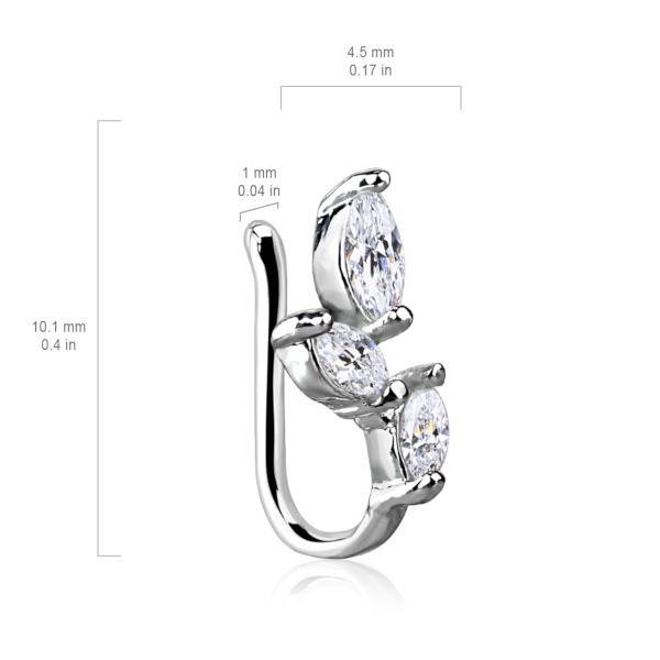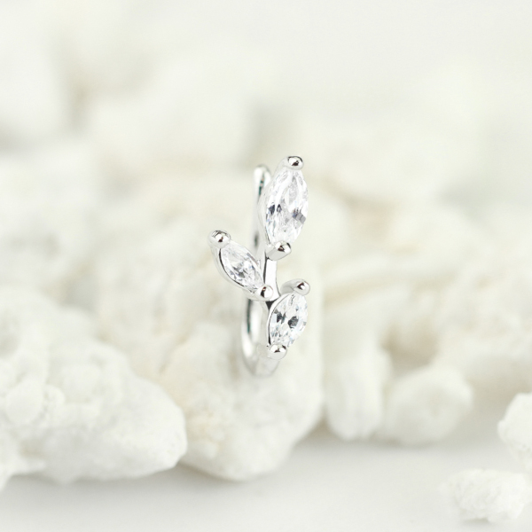 Фигурная обманка, имитирующая нострил, в форме ростка из родированной латуни украшена тремя кристаллами.