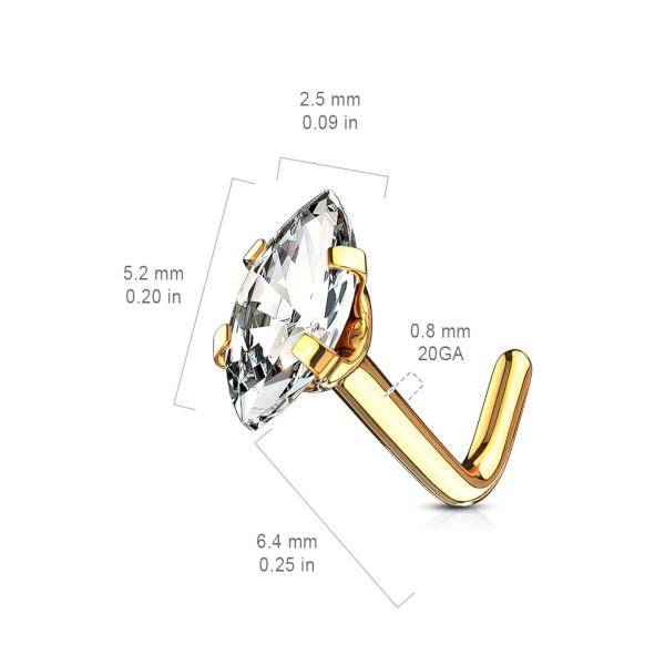 Нострил из хирургической стали 316L с золотым IP покрытием украшен стразом огранки "маркиз" размером 3х5 мм.