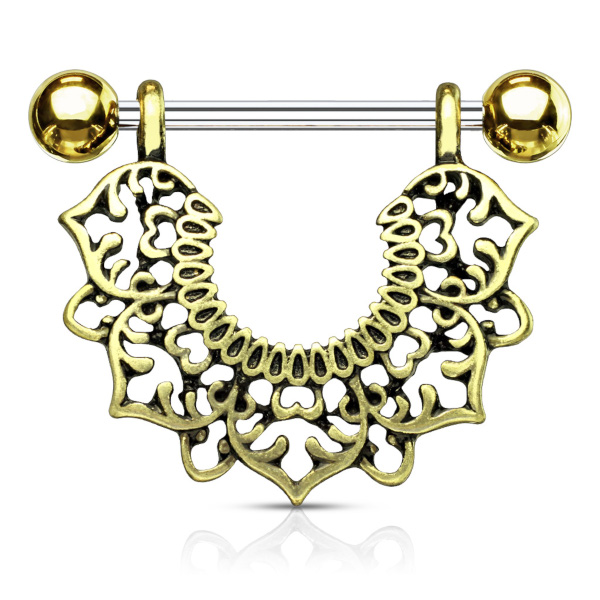 Украшение для груди со штангой из хирургической стали 316L и декоративной частью из родированной латуни. Представлена вариация с золотым покрытием.