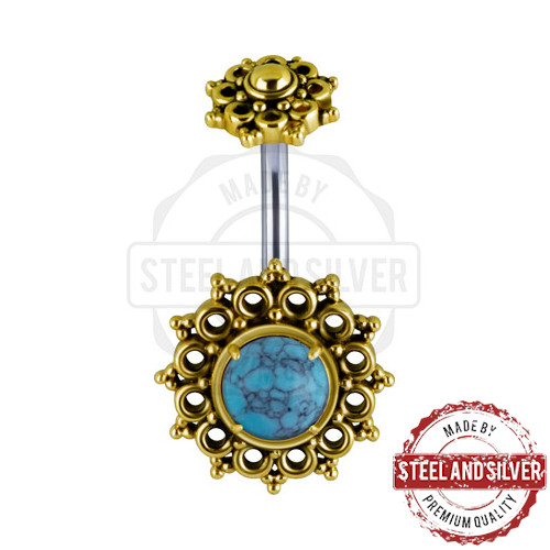 Банан со штангой из хирургической стали 316L. Декоративная часть из латуни украшена искусственной бирюзой.