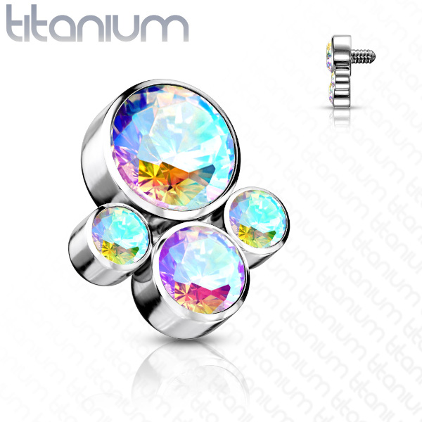 Кластер из имплантационного титана 6Al-4V-Eli ASTM: F-136 украшен стразами. Резьба 0,9мм подходит для украшений толщиной 1 и 1,2мм с внутренней резьбой, резьба 1,2мм подходит для украшений толщиной 1,6мм с внутренней резьбой.