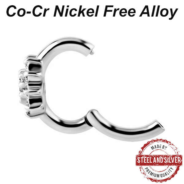 Овальный кликер из кобальт-хрома. Украшен кристаллами Premium Cubic Zirconia. Диаметр декоративной части - 7мм. В описании указан цвет кристалла в центре.