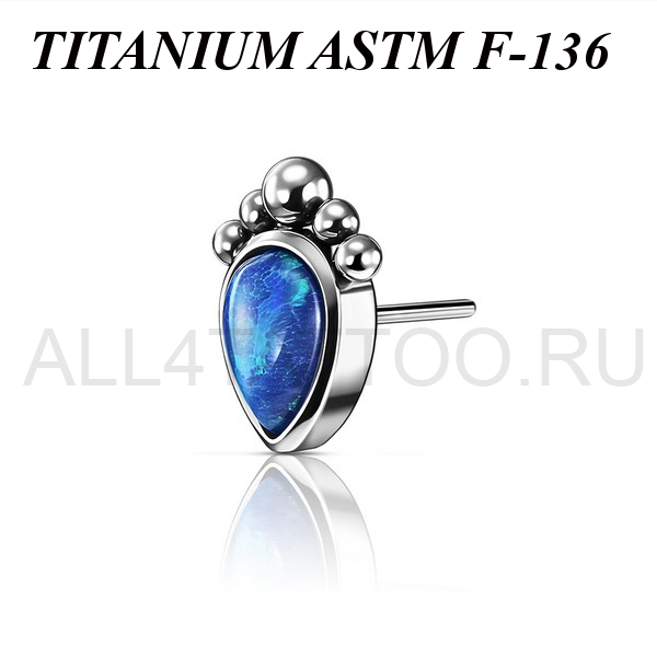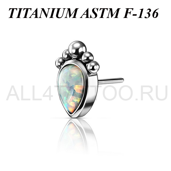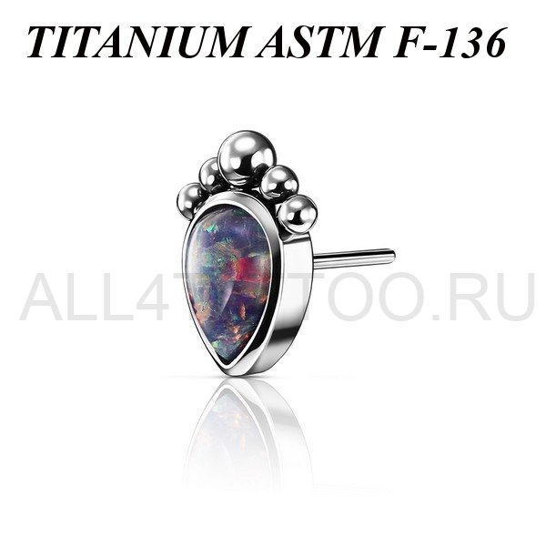 Вставка из имплантационного титана 6Al-4V-Eli ASTM: F-136 для безрезьбовых украшений. Украшена лабораторным опалом в форме капли. Размер декоративной части 6х5мм.