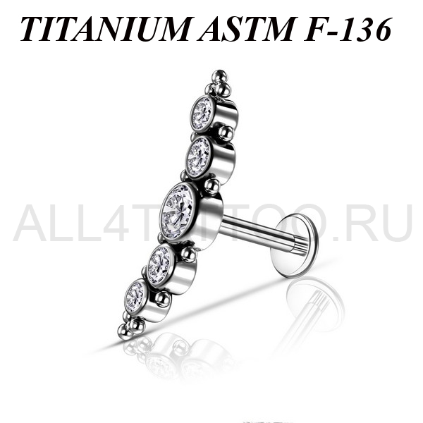 Лабрет с внутренней резьбой из имплантационного титана 6Al-4V-Eli ASTM: F-136. Украшен кластером с прозрачными фианитами. Размер декоративной части: 5х17мм.