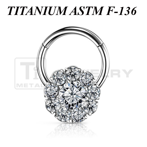 Кликер из имплантационного титана 6Al-4V-Eli ASTM: F-136 с декоративной частью в форме цветка, украшенного прозрачными фианитами. Диаметр декоративной части: 8мм.