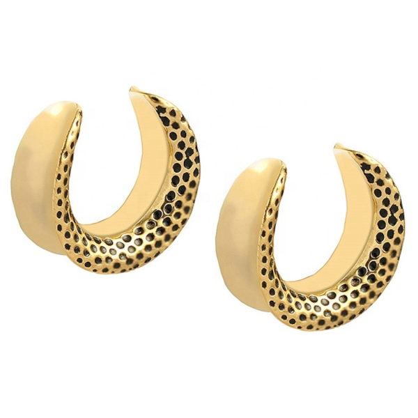 Тоннель из 316L стали с золотым PVD покрытием и бортами в форме полумесяца. Украшен рельефным рисунком.