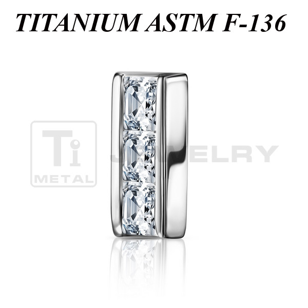 Накрутка из имплантационного титана 6Al-4V-Eli ASTM: F-136. Украшена тремя квадратными прозрачными фианитами. Размер декоративной части: 5х2мм. Подходит для украшений с внутренней резьбой.