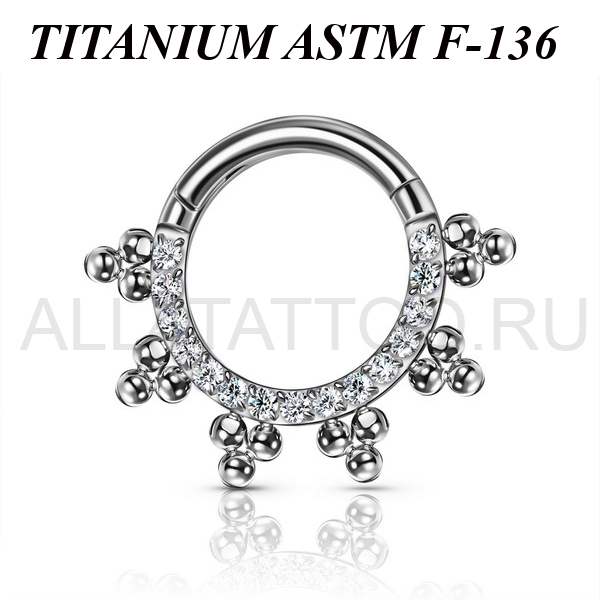 Кликер из имплантационного титана 6Al-4V-Eli ASTM: F-136 с рядом миниатюрных титановых шариков и сетом прозрачных фианитов.