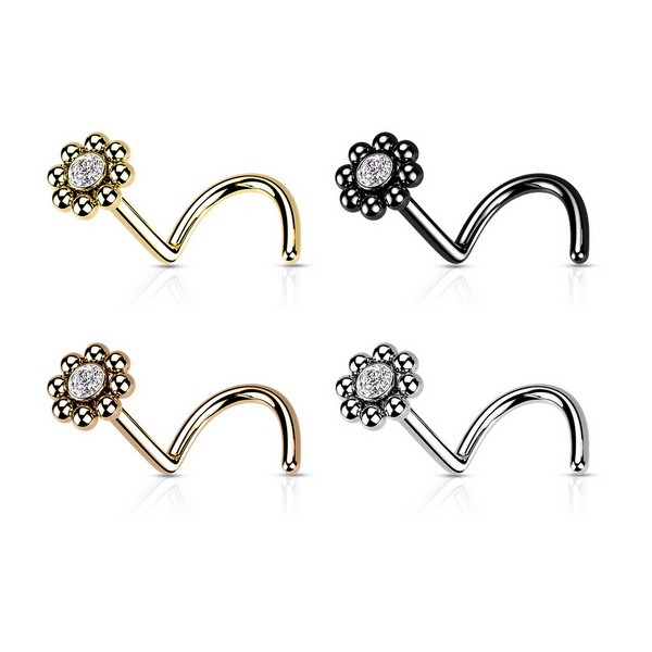 Нострил из хирургической стали 316L украшен кластером с прозрачным кристаллом. Представлен в трёх вариантах: классический стальной, с PVD покрытием жёлтого и розового золота.