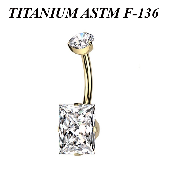 Банан с внутренней резьбой из имплантационного титана 6Al-4V-Eli ASTM: F-136 с золотым PVD покрытием. Украшен крупным прямоугольным кристаллом. Размер кристалла: 8х10мм.