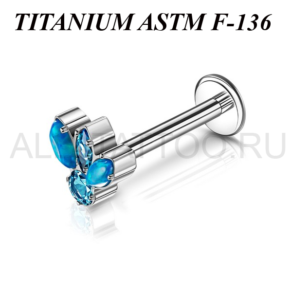 Лабрет с внутренней резьбой из имплантационного титана 6Al-4V-Eli ASTM: F-136. Украшен кластером с цветными фианитами и лабораторными опалами. Размер декоративной части: 6х6мм.
