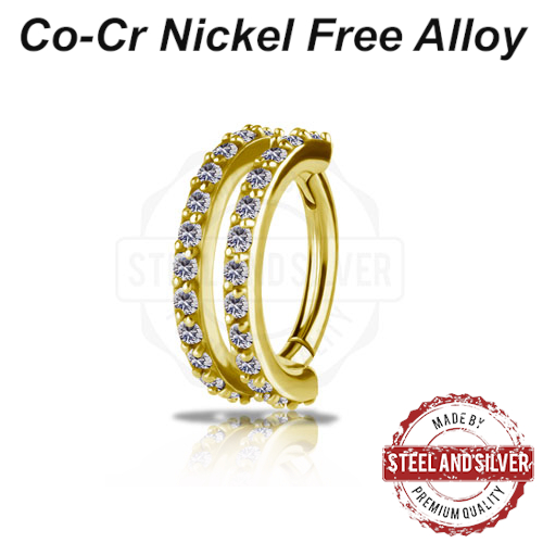 Овальный кликер из сплава кобальт-хрома, без содержания никеля с 18-каратным золотым PVD покрытием. Украшен прозрачными кристаллами Premium Cubic Zirconia. Идеален для прокола "Руук".