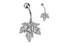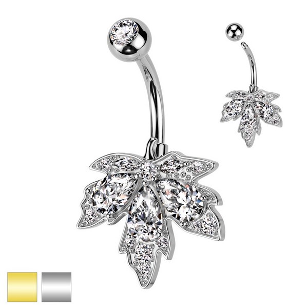 Банан из хирургической стали 316L с декоративной частью из родированной латуни, украшенной прозрачными фианитами. Представлен в двух вариантах: классический стальной и с золотым PVD покрытием.
