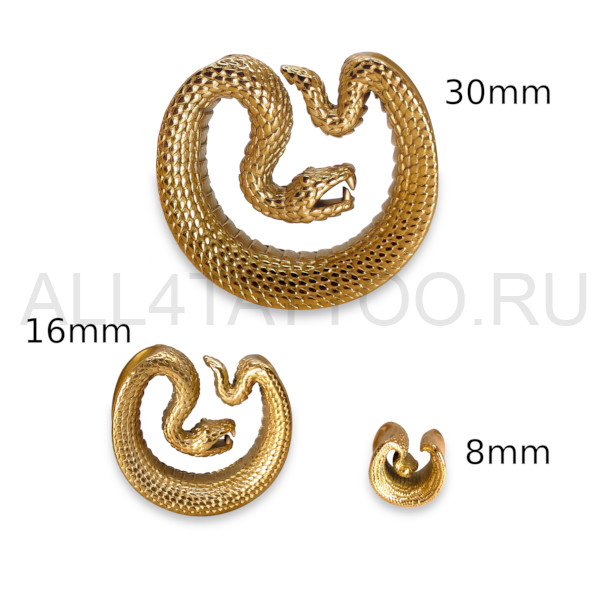 Тоннели из хирургической стали 316L в виде змеи. Представлены в двух вариантах: классические стальные и с золотым PVD покрытием.