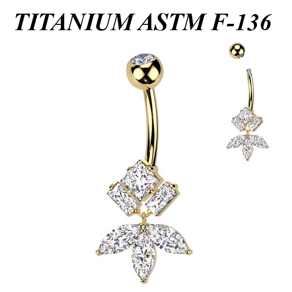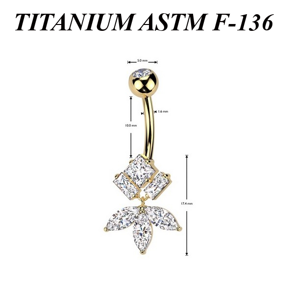 Банан из имплантационного титана 6Al-4V-Eli ASTM: F-136 с декоративной частью из родированной латуни в сочетании с фианитами. Размер декоративной части: 17х12,3мм. Представлен в двух вариантах: классический титановый и с золотым PVD покрытием.