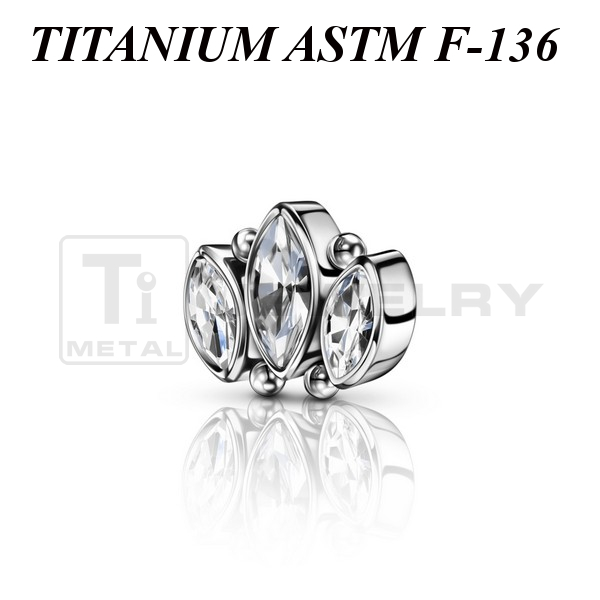 Накрутка из имплантационного титана 6Al-4V-Eli ASTM: F-136 с прозрачными фианитами огранки "маркиз". Размер накрутки: 6,3х5мм. Подходит для украшений с внутренней резьбой толщиной 1 и 1,2 мм.