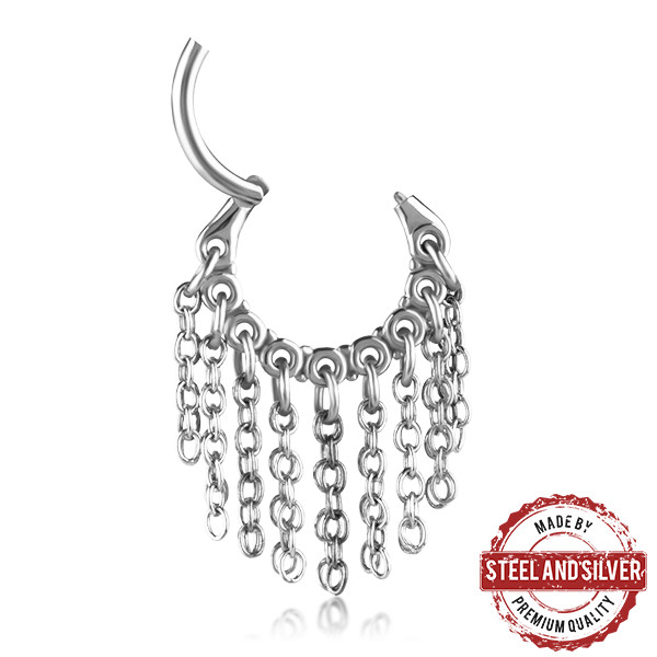 Кликер из хирургической стали 316L. Представлен в двух вариантах: классический стальной и с золотым 24х каратным PVD покрытием. Украшен тонкими цепочками.