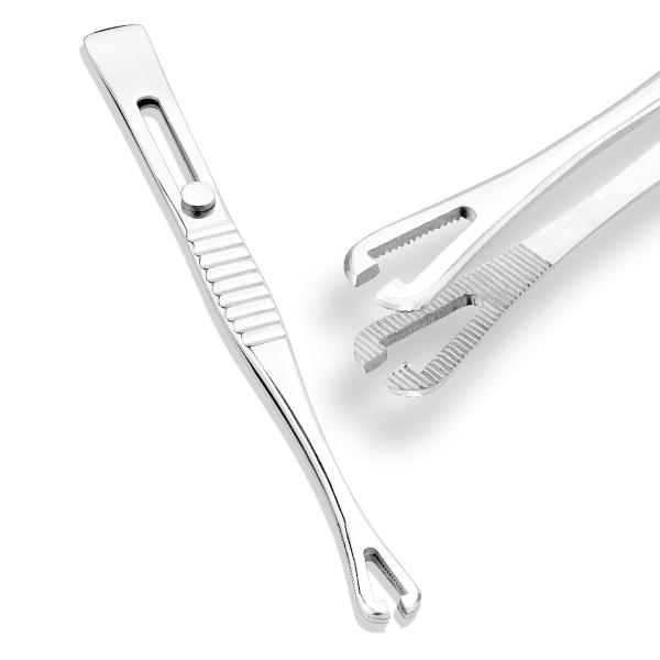 Треугольный зажим для пирсинга в форме пинцета с фиксатором-ползунком.